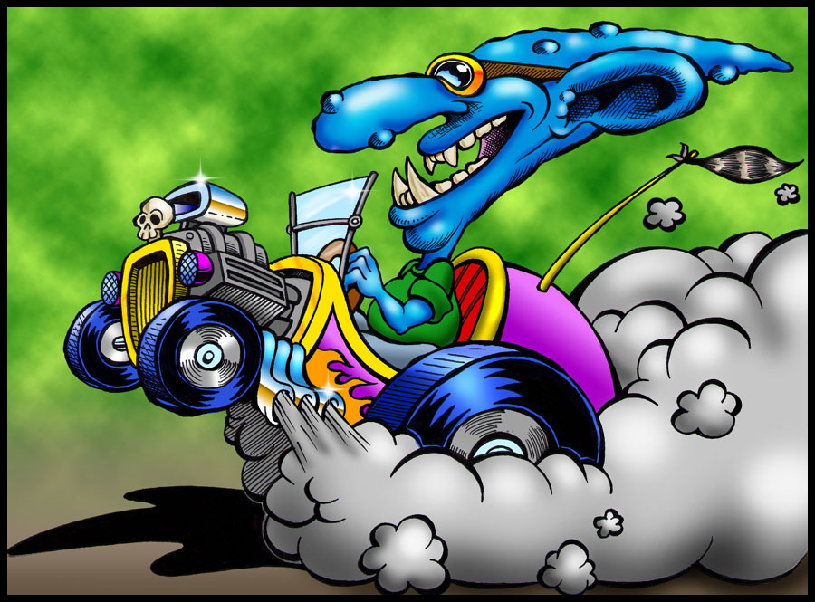 art, artwork, cartoon art, cartoon illustration, cartooning, cartoonist, cartoons, comics, concept art, drawing, funny, games, humor, humorous illustration, illustration, ink, monsters, Photoshop, sketch, sketchbook, sketching, strange, weirdAnother old piece of concept art I created for a video game proposal that didn’t go anywhere. I still like the concept of monsters driving classic hot rods. 🙂